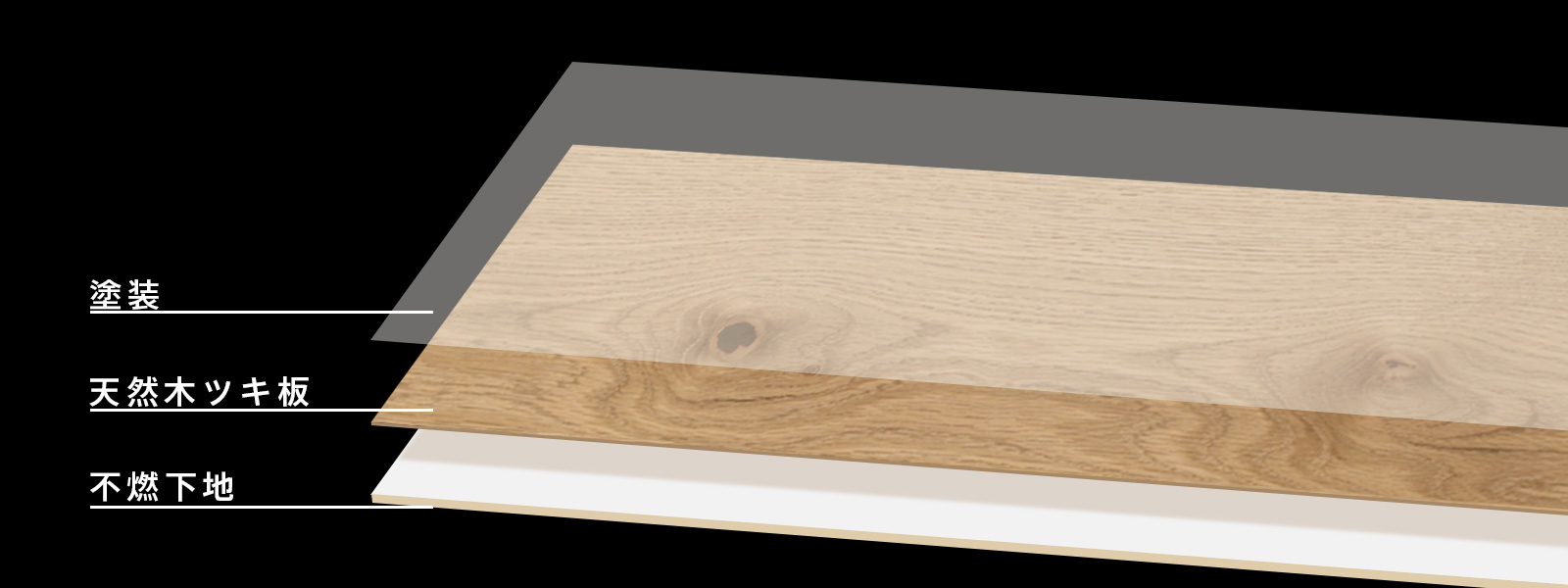 不燃下地(ダイライト)に天然木ツキ板を重ねた構造となっています。また木材に薬液を注入させ不燃性能を高めた不燃木材とは違い、白華現象や施工後に修繕やメンテナンスが必要となる事も少なく安心してお使いいただけます。