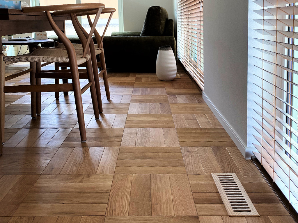 何年たっても飽きのこないスタンダートな風合いで、落ち着きのある雰囲気を演出しています。アクセントに六角形タイルと組み合わせて張られた部分もあってセンスを感じます。