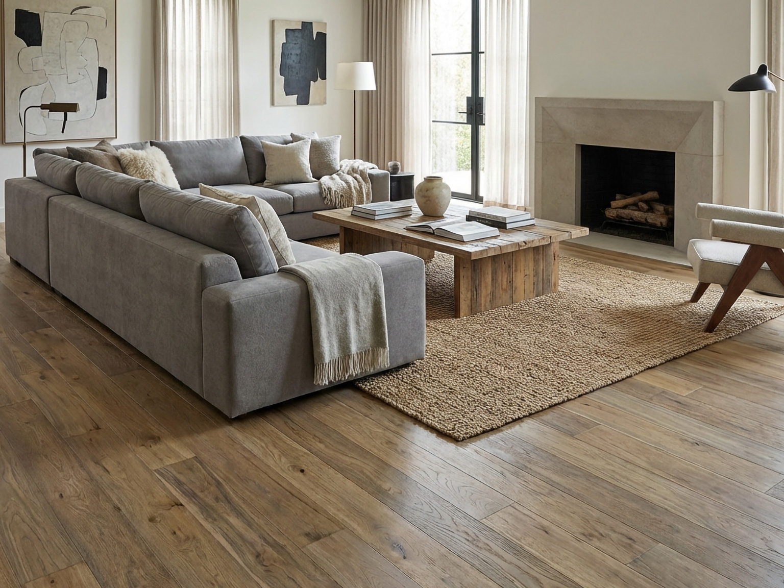 リビングにウェザードオーク複合乱尺フローリングを使用したイメージ。幅は150mm、ビンテージ感が漂う味のあるオークです。