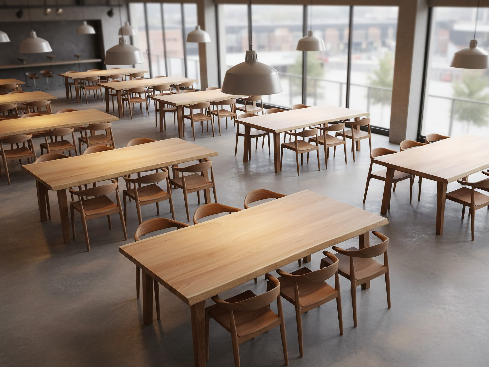 社員食堂にクルミ 節有テーブル・カウンタートップを使用したイメージ。天然木の温かみある風合いが憩いの場にマッチしています。