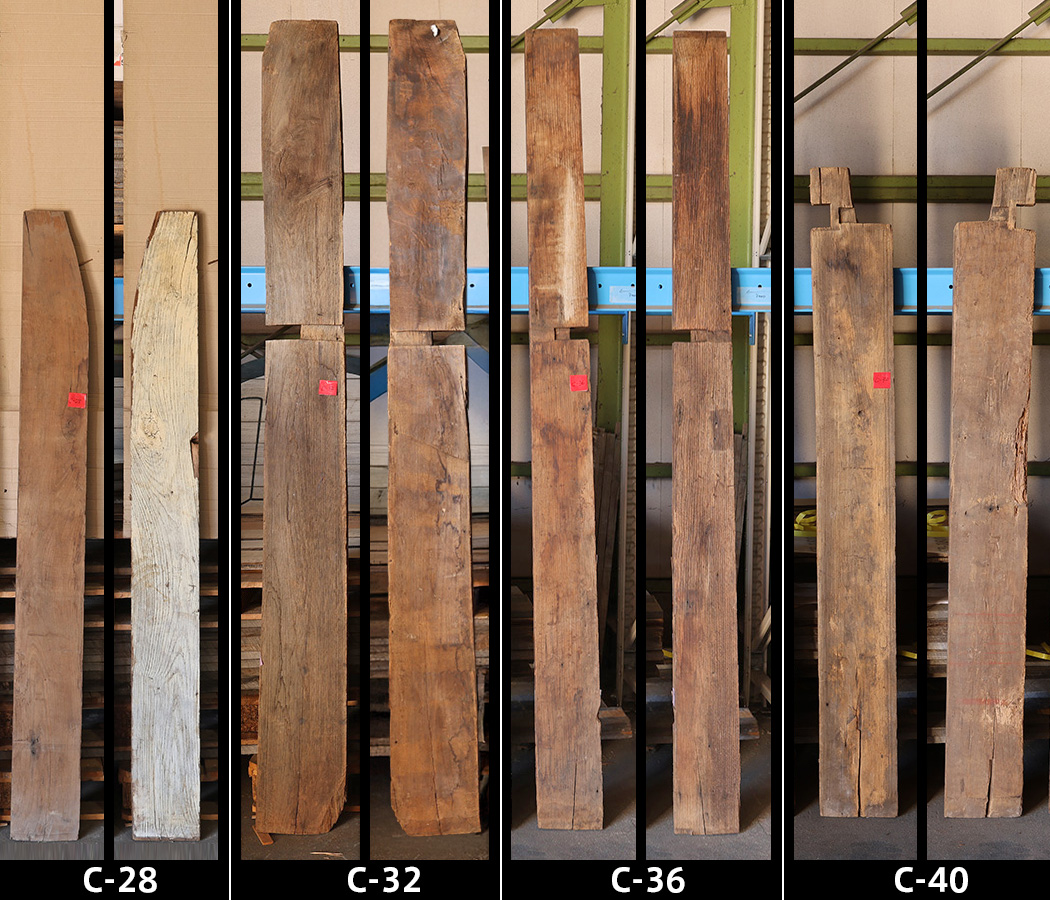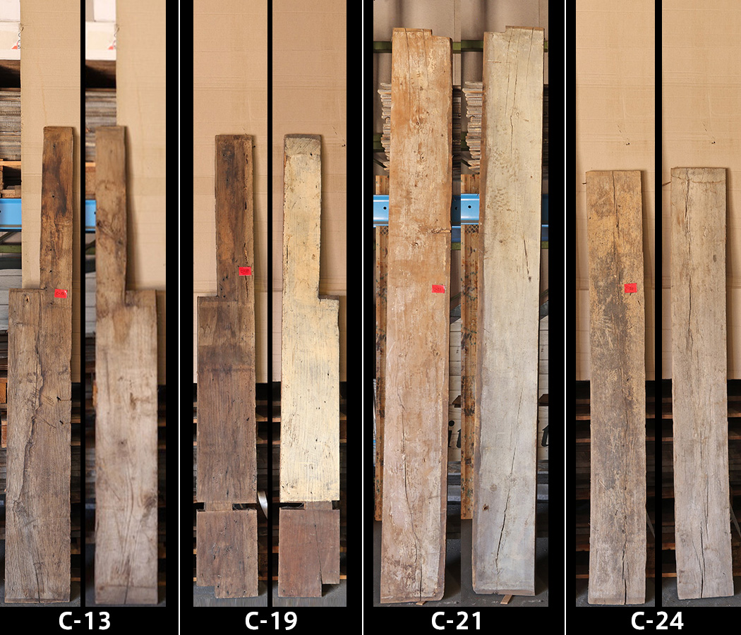 棚板や造作材など内装材として使われていたクリの古材です。長い年月の間に付いたいろんな傷跡がいい味を出しています。